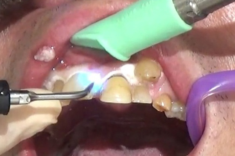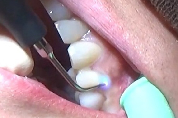 深い歯周ポケットに青いレーザー光と過酸化水素水を照射し、患部を殺菌しています。